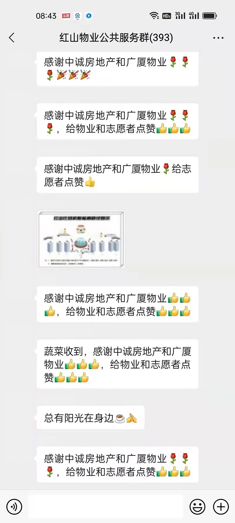 隨后,在社區(qū)志愿者的協(xié)助下,“愛(ài)心蔬菜包”安全順利地送到每一戶(hù)業(yè)主手中。看著業(yè)主群里邊對(duì)中誠(chéng)公司和廣廈物業(yè)持續(xù)刷屏的稱(chēng)贊與感謝,每個(gè)人都忘記了辛苦,滿(mǎn)臉的汗水融化成了滿(mǎn)臉的笑容,那勒出紅印的雙手也成為了愛(ài)心的印記。